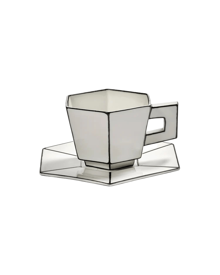 Deze kop & schotel uit de Carte Blanche collectie is ontworpen door Annebet Philips en gebaseerd op de vouwlijnen van een kartonnen model. Maar dan in porselein uitgevoerd. Door de vouwlijnen te accentueren met zwart glazuur ontstaat een speels effect en lijkt het alsof het product zo in een toneeldecor kan staan.